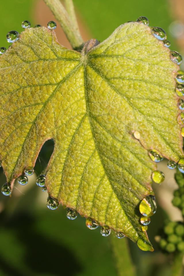 Wallpaper Water droplets on a young leaf of grapes in spring