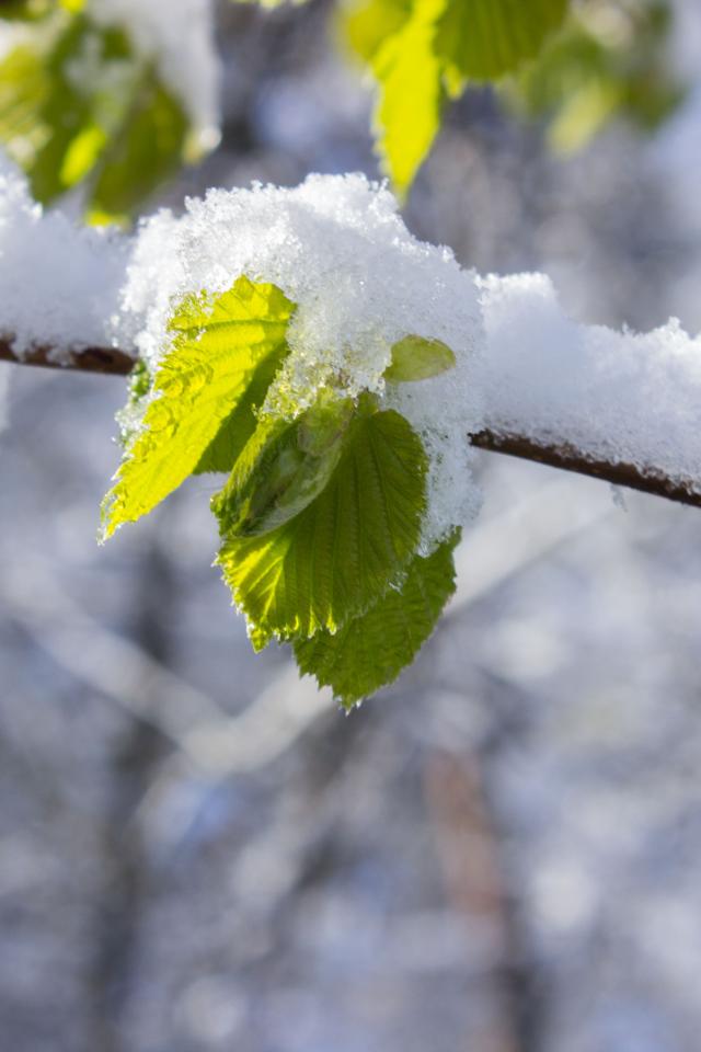 Wallpaper Snow on a branch with green leaves in spring