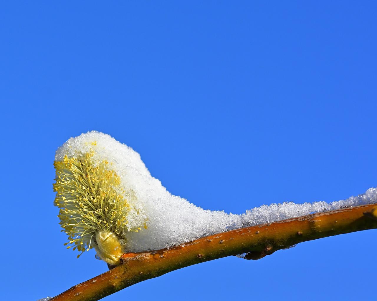 Wallpaper Snow on a branch with a bud against a blue sky