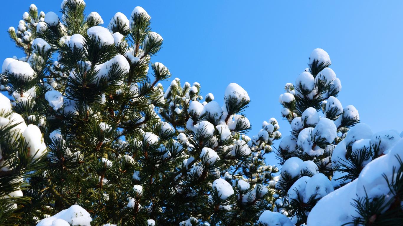 Wallpaper Snow lies on pine branches under the blue sky