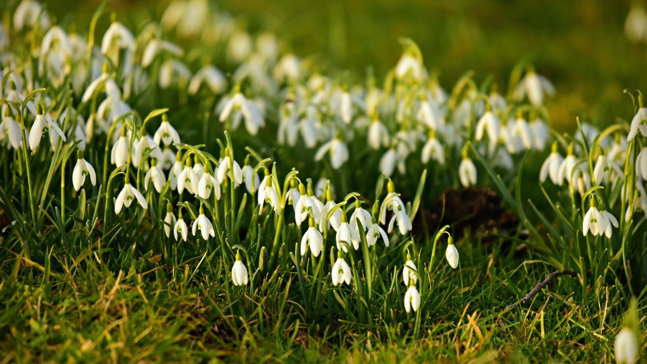 Wallpaper Many small white snowdrops on green grass in spring