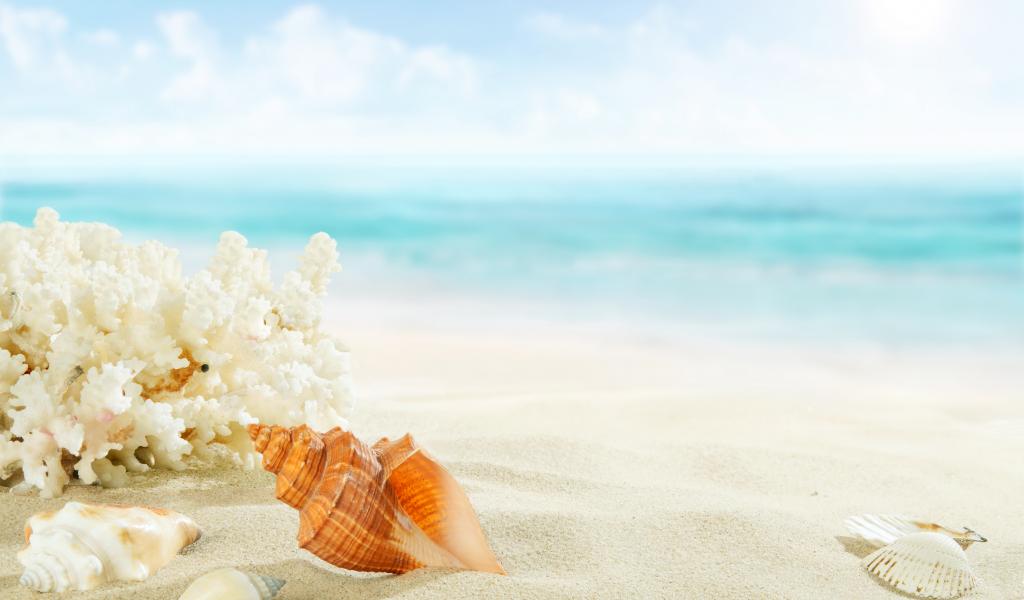 Wallpaper Corals and shells on white sand by the sea in summer