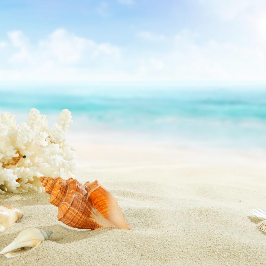 Wallpaper Corals and shells on white sand by the sea in summer