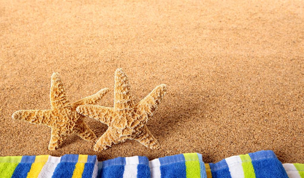 Wallpaper Two starfish on the yellow sand with a towel