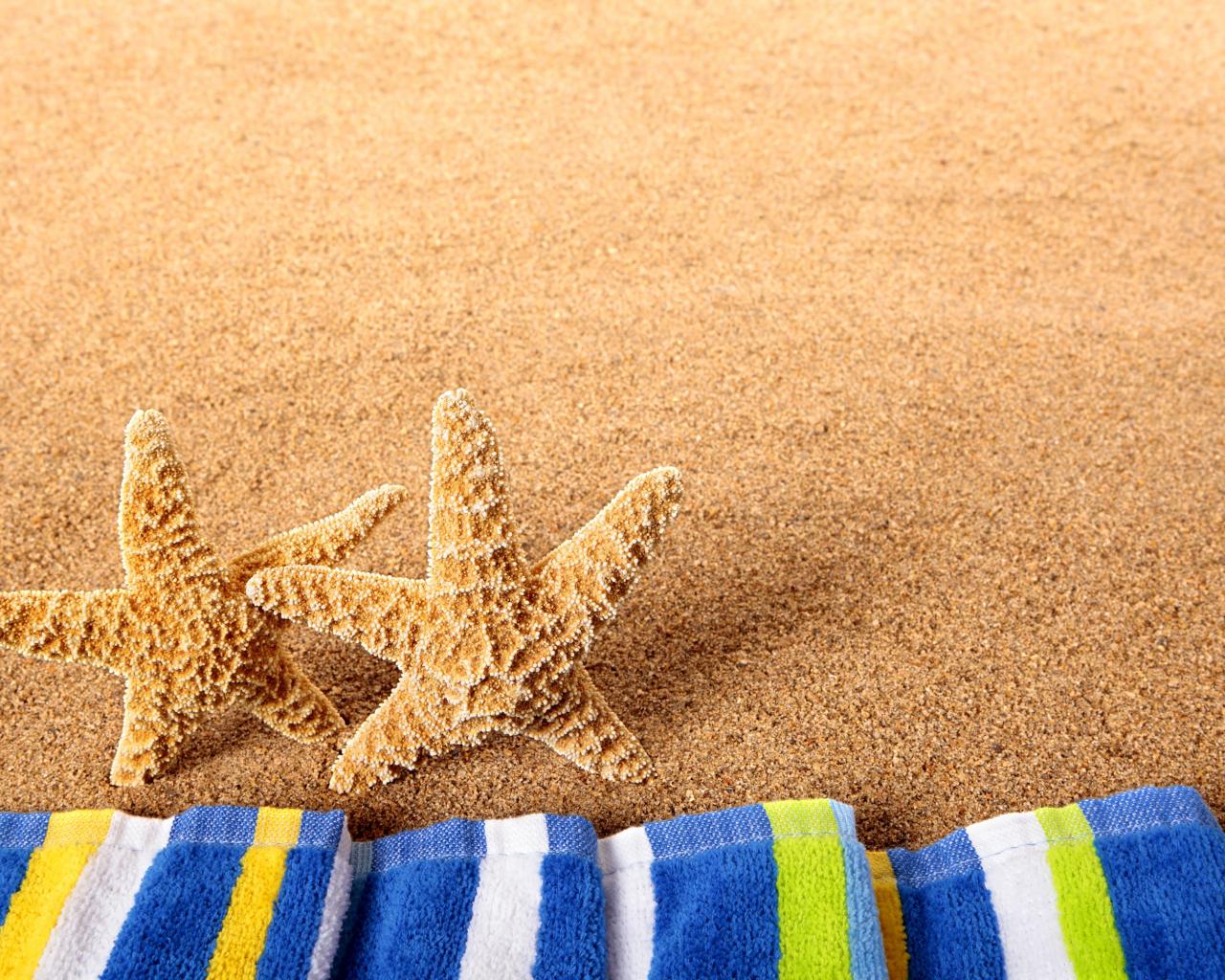 Wallpaper Two starfish on the yellow sand with a towel