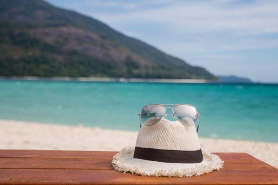 Wallpaper A white hat with glasses lies on a bench by the sea