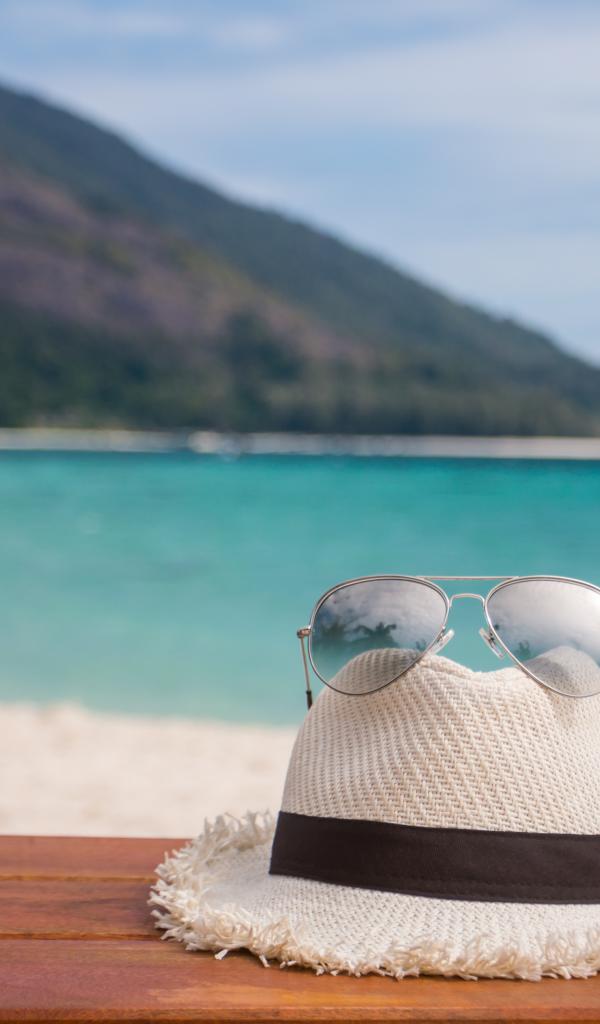 Wallpaper A white hat with glasses lies on a bench by the sea