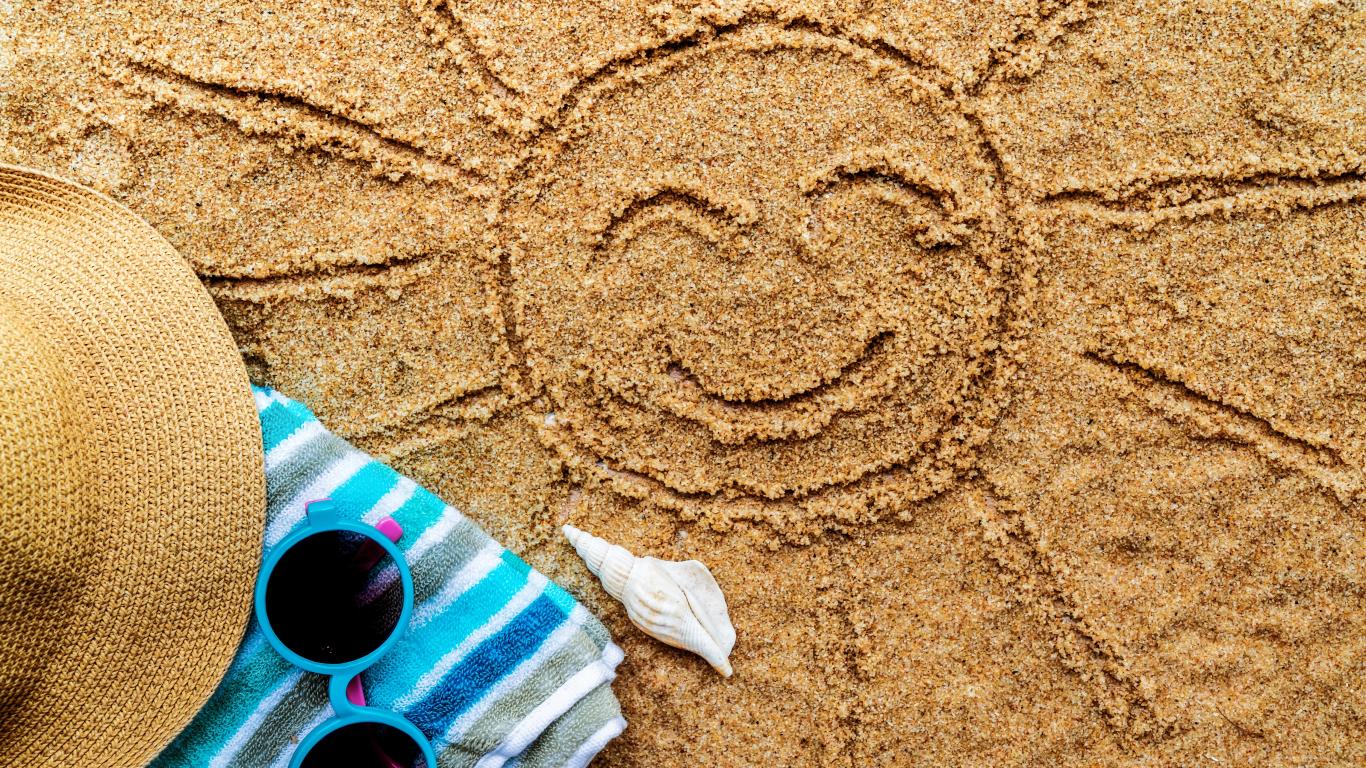 Wallpaper Sand drawn sun with hat and glasses in summer