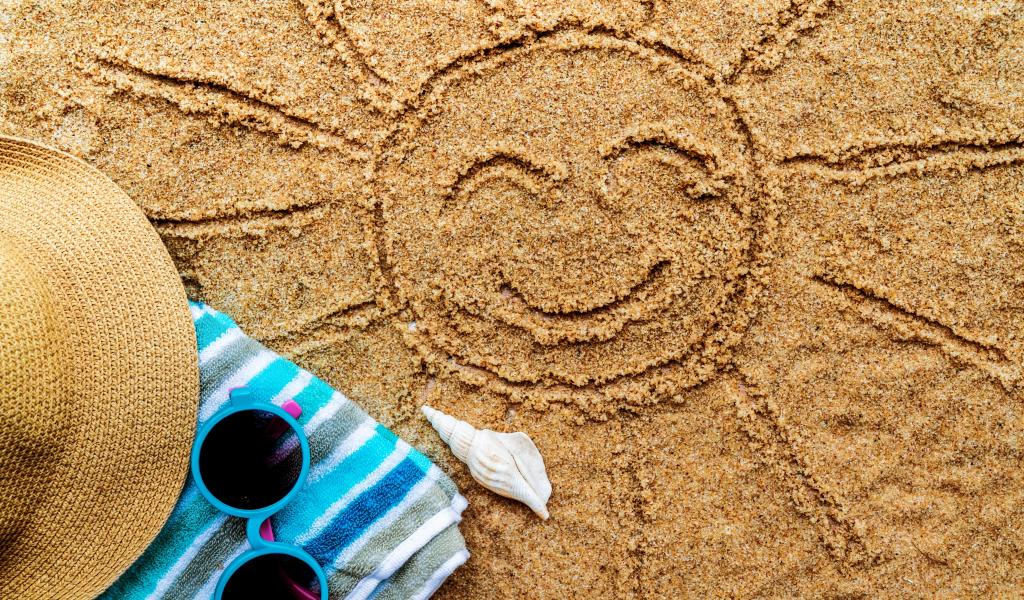 Wallpaper Sand drawn sun with hat and glasses in summer