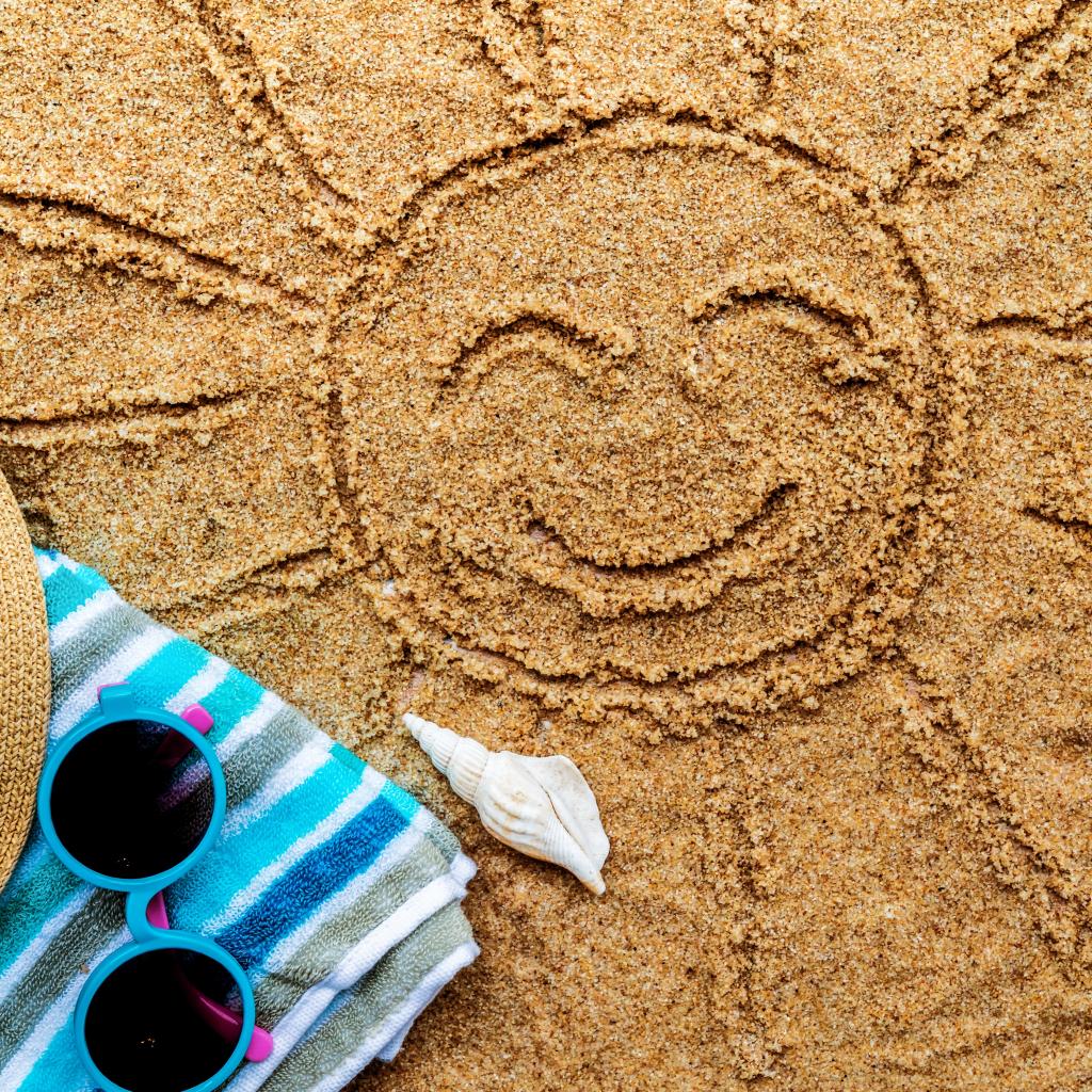 Wallpaper Sand drawn sun with hat and glasses in summer