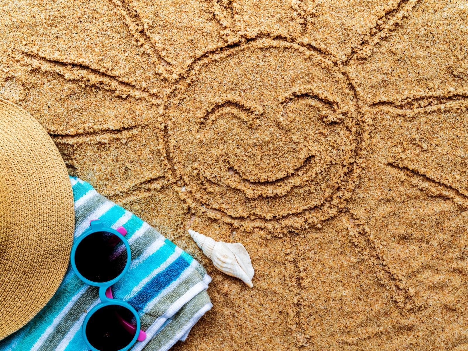 Wallpaper Sand drawn sun with hat and glasses in summer