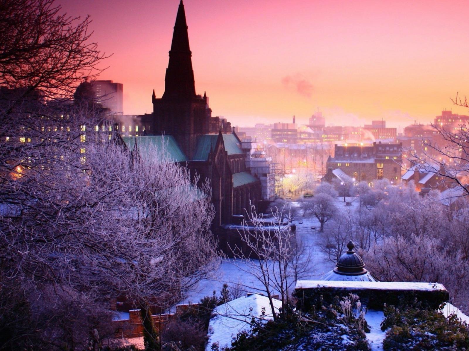 Wallpaper Pink winter sunset over a city