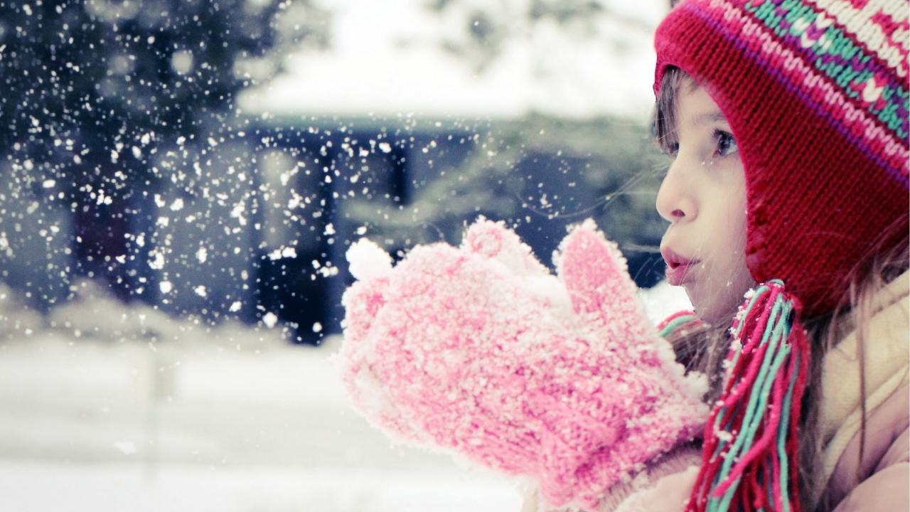 Wallpaper Girl blows off the white snow with mittens