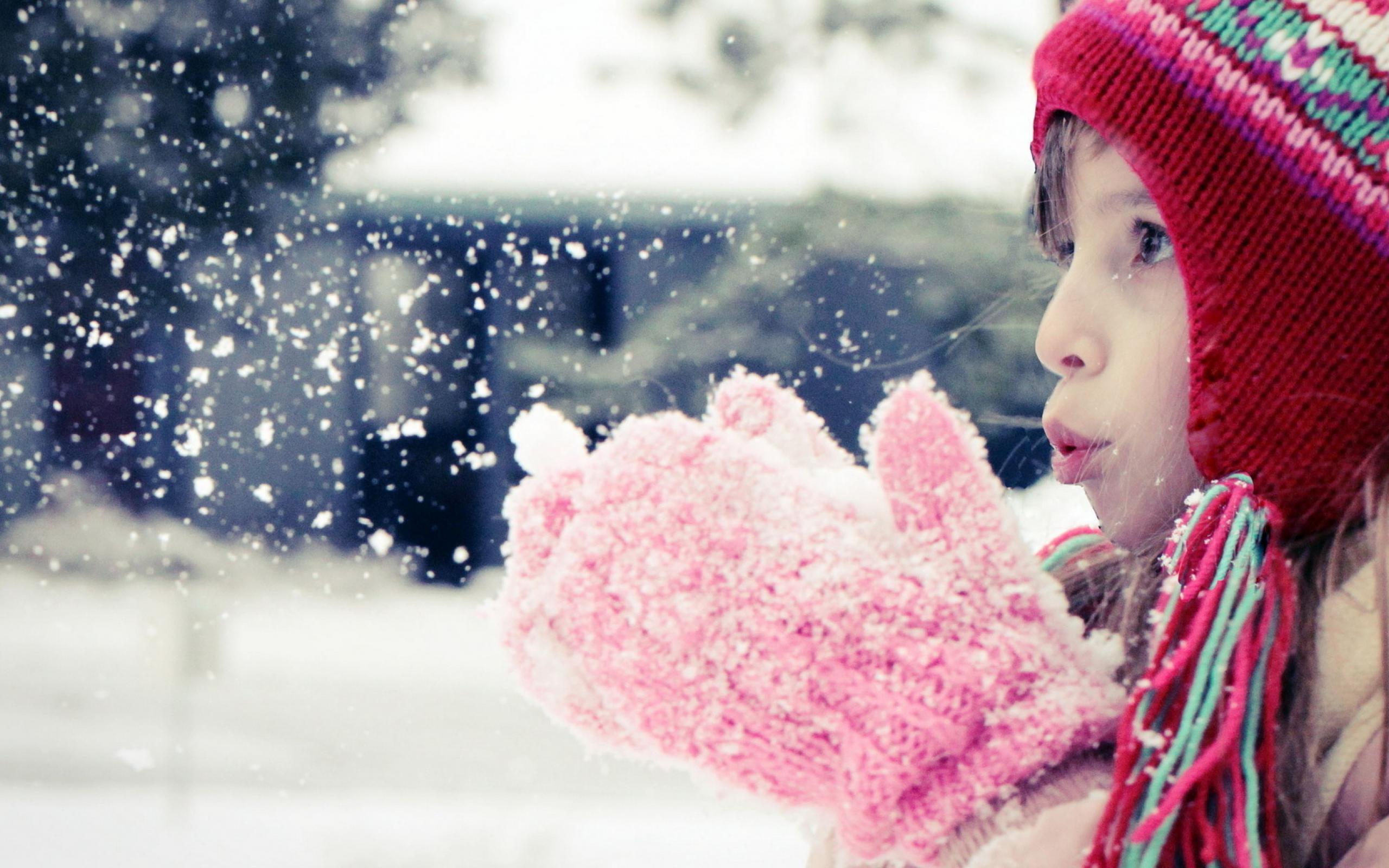 Wallpaper Girl blows off the white snow with mittens