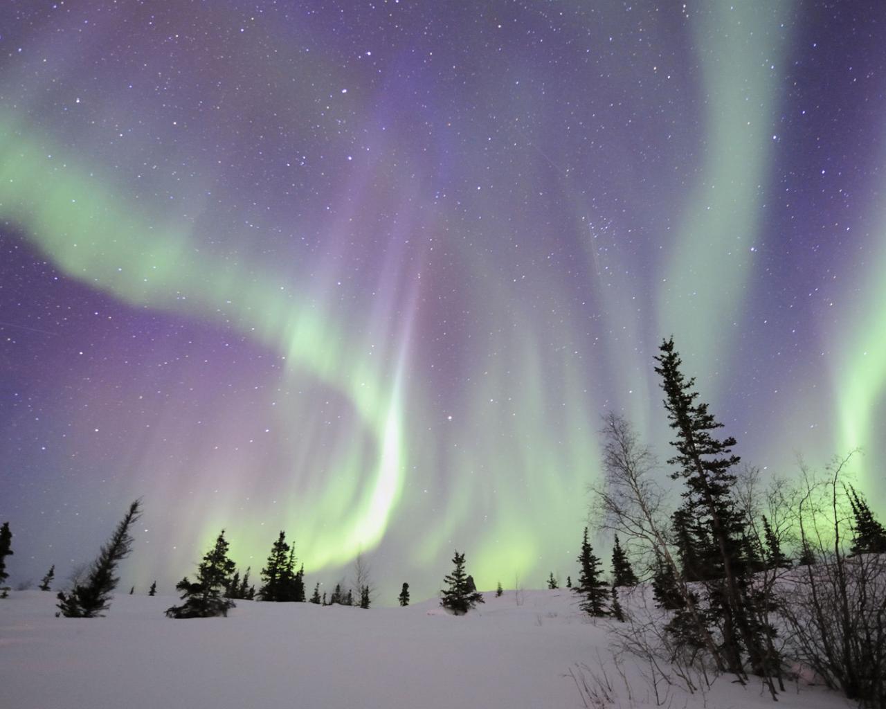 Wallpaper Northern lights over the winter forest