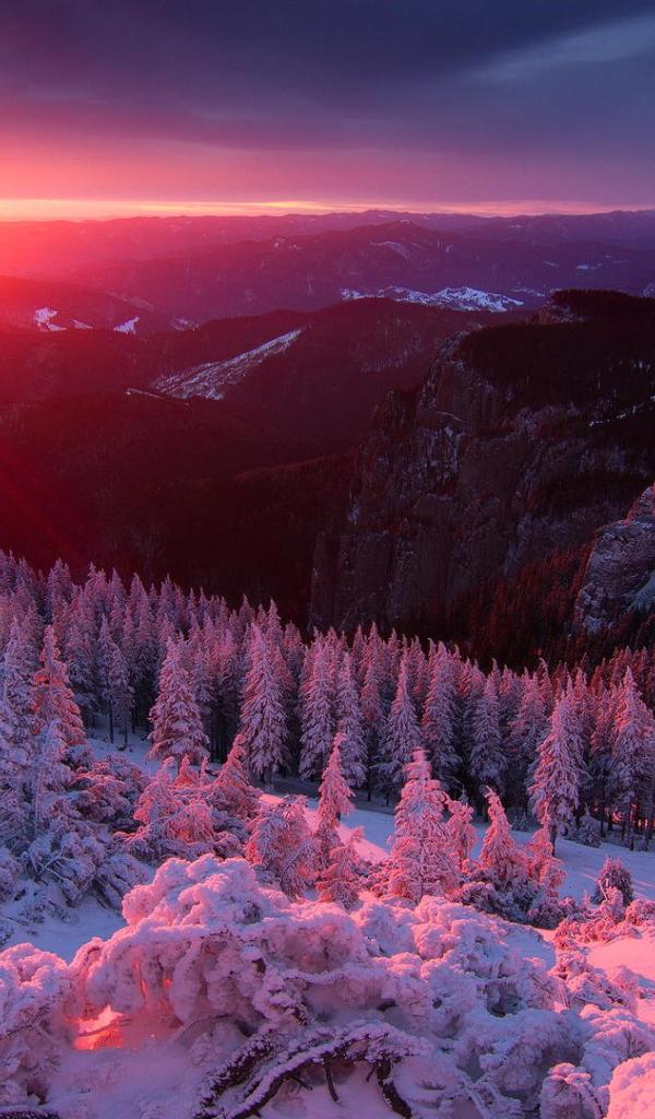 Wallpaper Pink winter sunrise over the forest