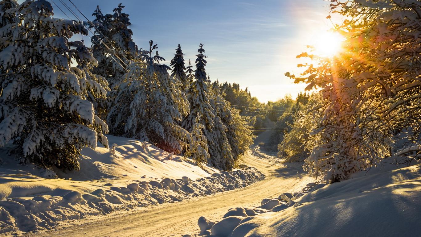 Wallpaper Snow covered trees in winter road