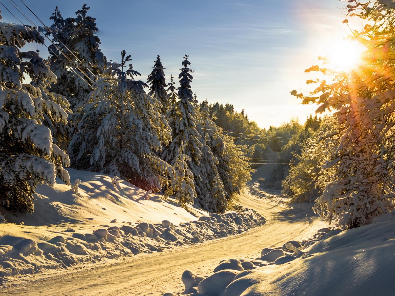 Wallpaper Snow covered trees in winter road
