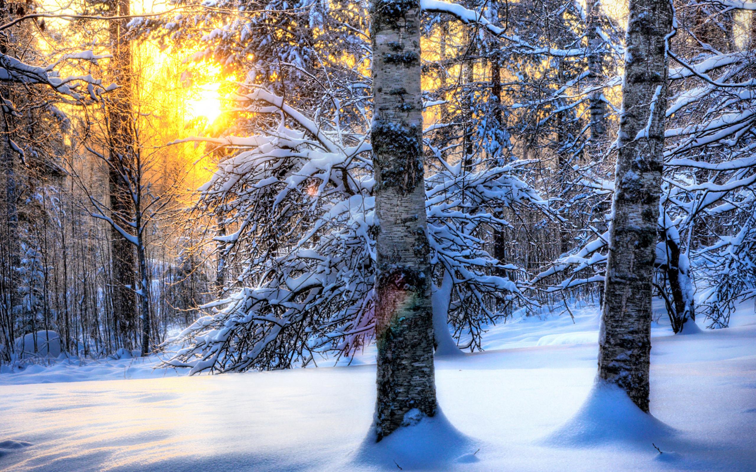 Wallpaper Snow-covered birch trees in the rays of winter sun