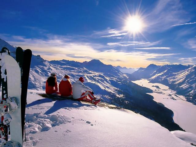 Wallpaper Snowboarders meet the dawn in the snowy mountains