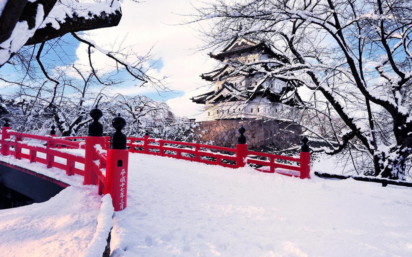 Wallpaper Winter Bridge with red railings in Japan