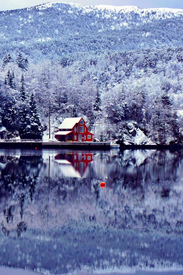 Wallpaper House, forest and mountain reflect in the lake in winter