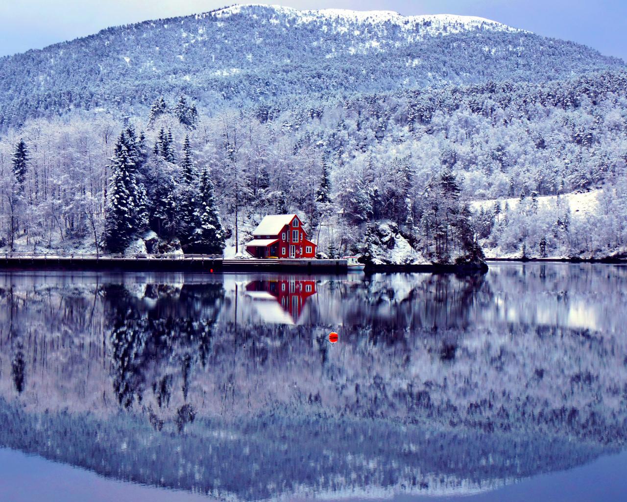 Wallpaper House, forest and mountain reflect in the lake in winter