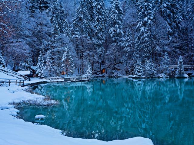 Wallpaper Snow-covered fir trees on the lake shore in winter, Switzerland