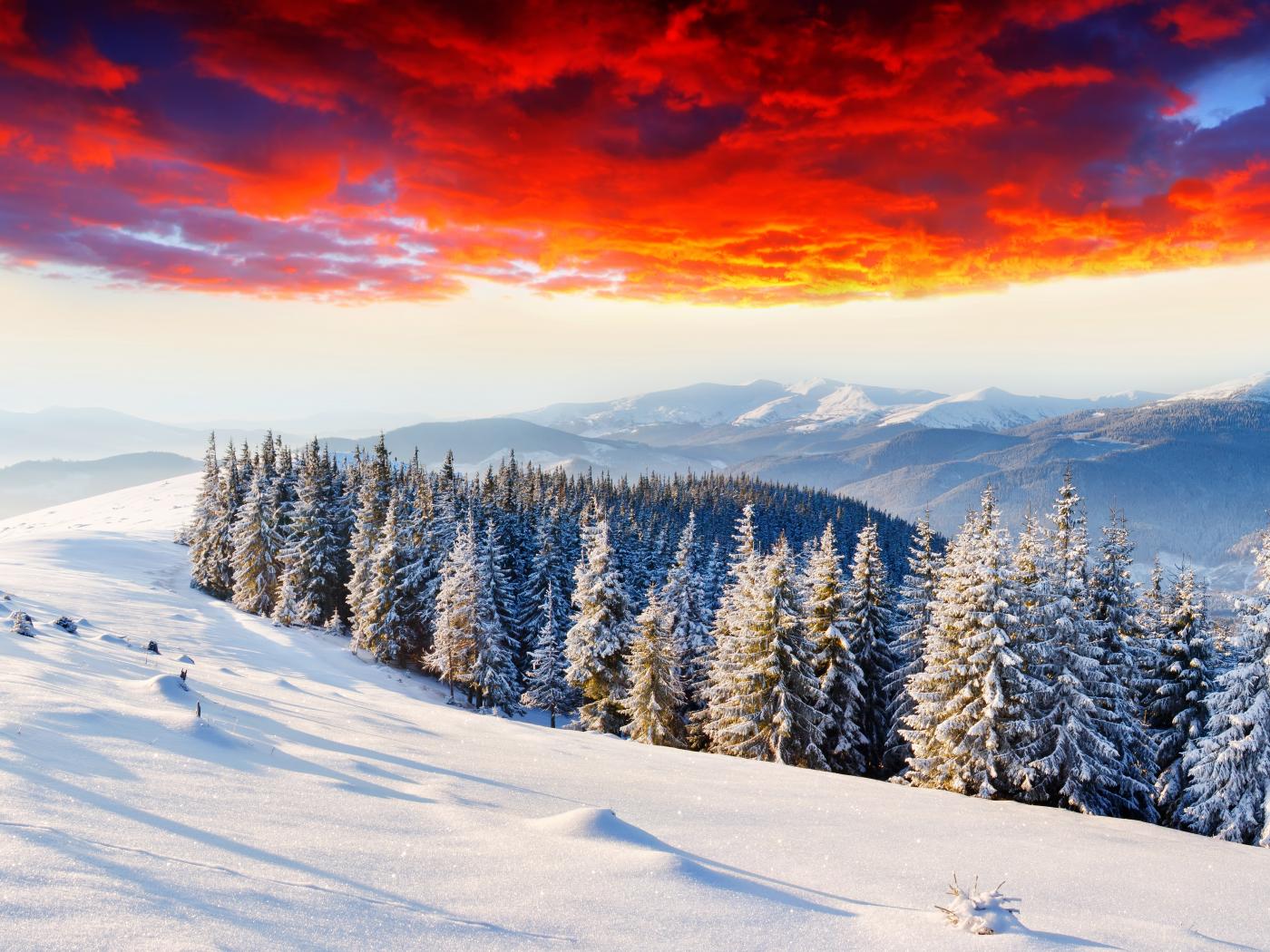 Wallpaper Beautiful landscape of winter forest under a red frosty sky
