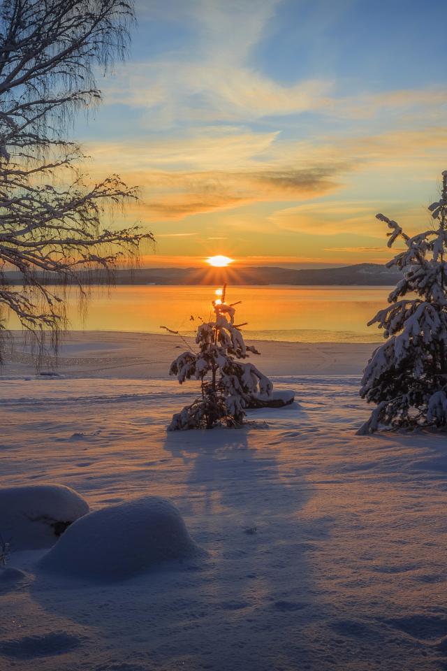 Wallpaper Sunset on the background of snow-covered trees in winter