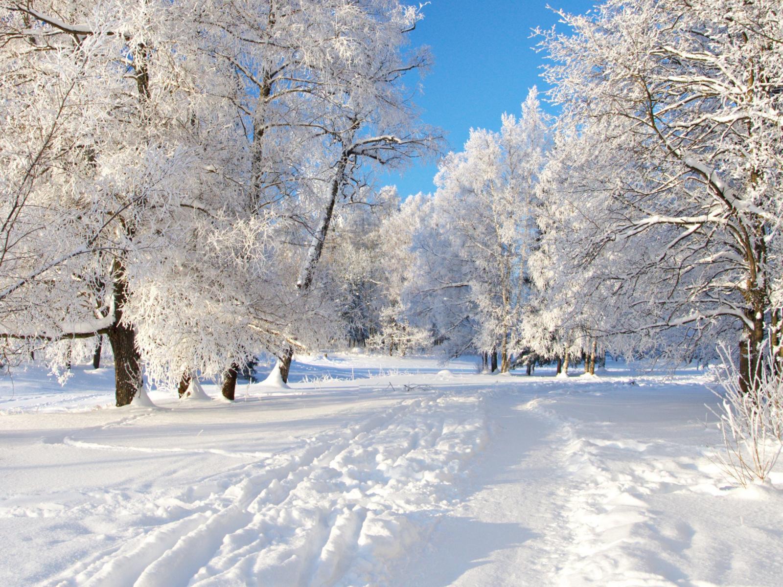 Wallpaper Beautiful frost-covered trees on a snowy road in winter