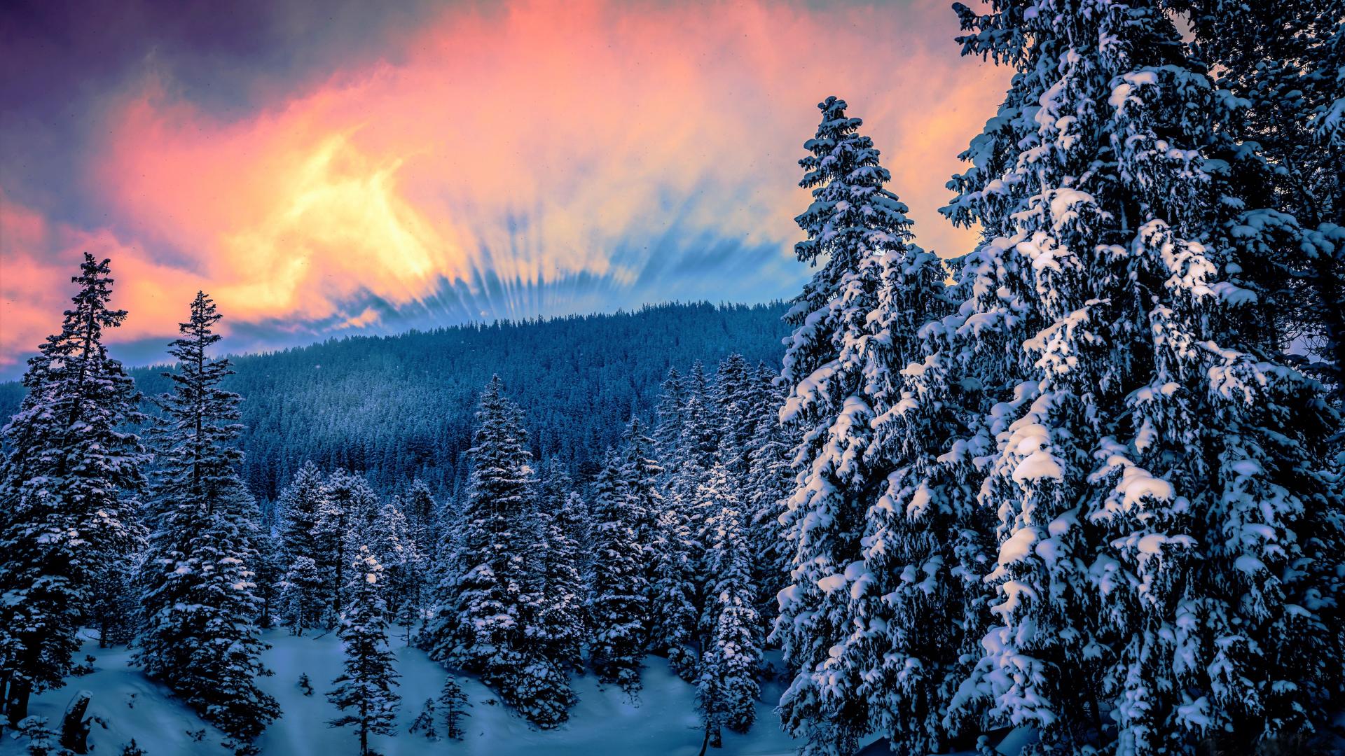 Wallpaper Sunrise over the snowy forest in winter