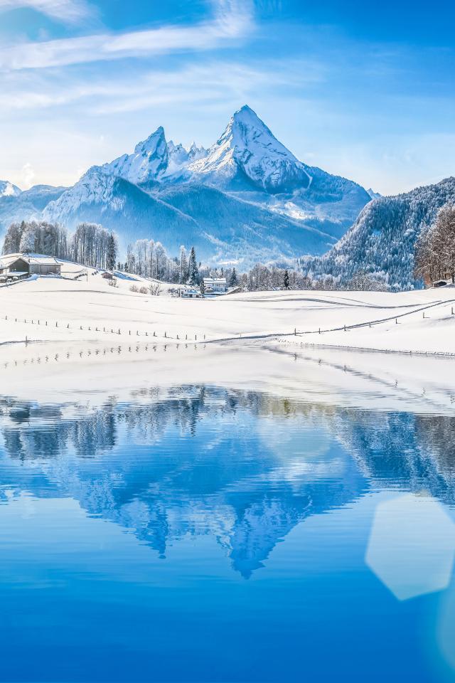 Wallpaper Blue water in the lake at the snow-capped mountains in winter