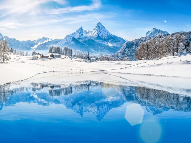 Wallpaper Blue water in the lake at the snow-capped mountains in winter