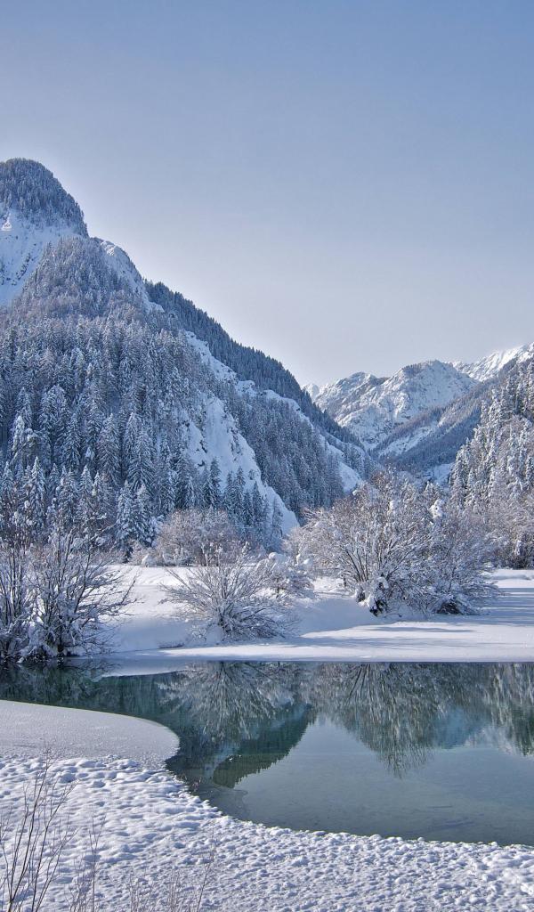 Wallpaper Mountains with snowy forest near a lake in winter