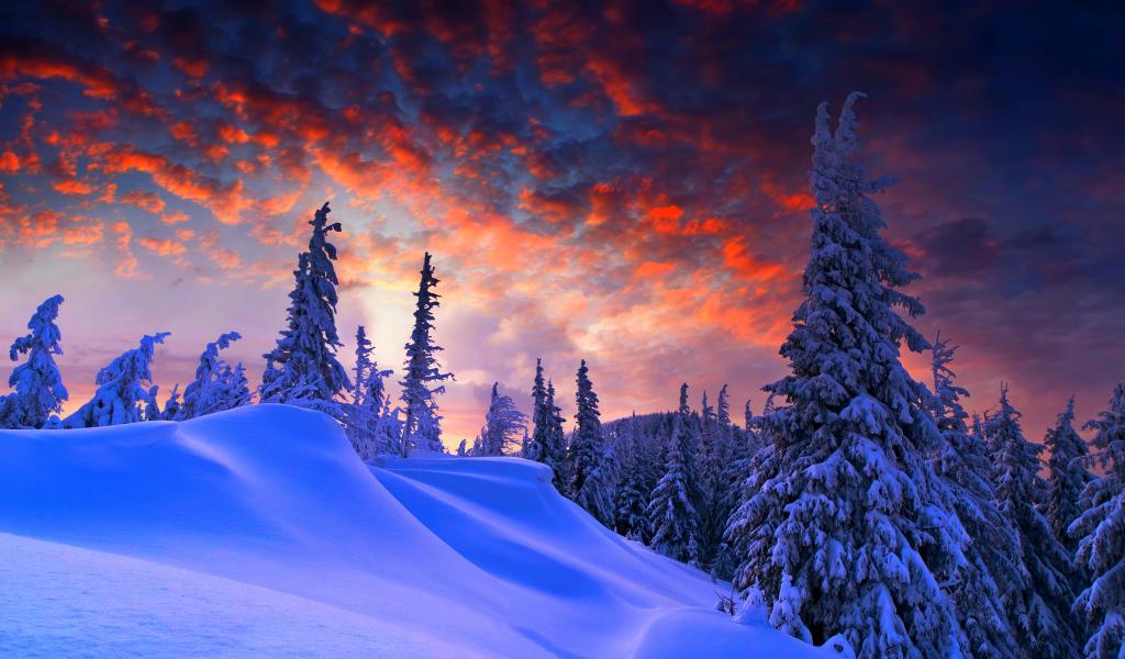 Wallpaper Red clouds in the sky above a snowy coniferous forest