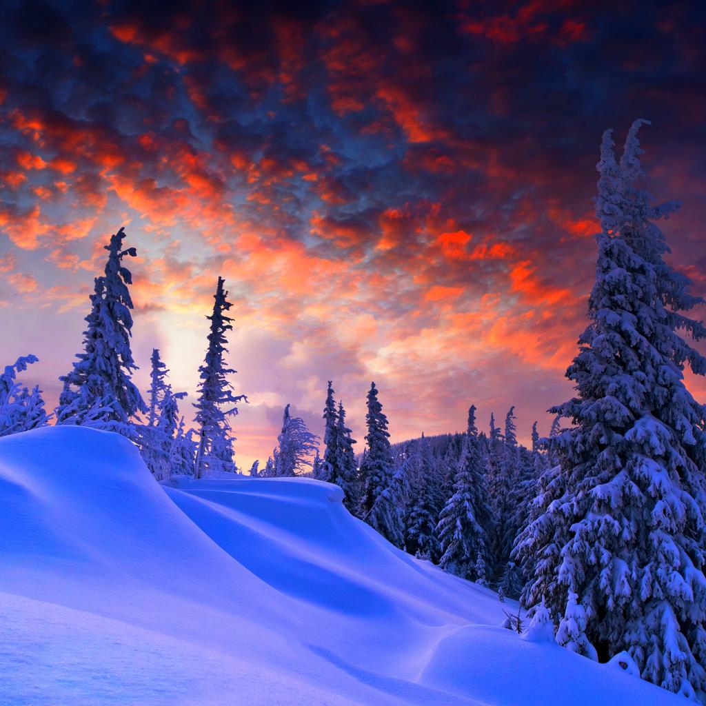 Wallpaper Red clouds in the sky above a snowy coniferous forest