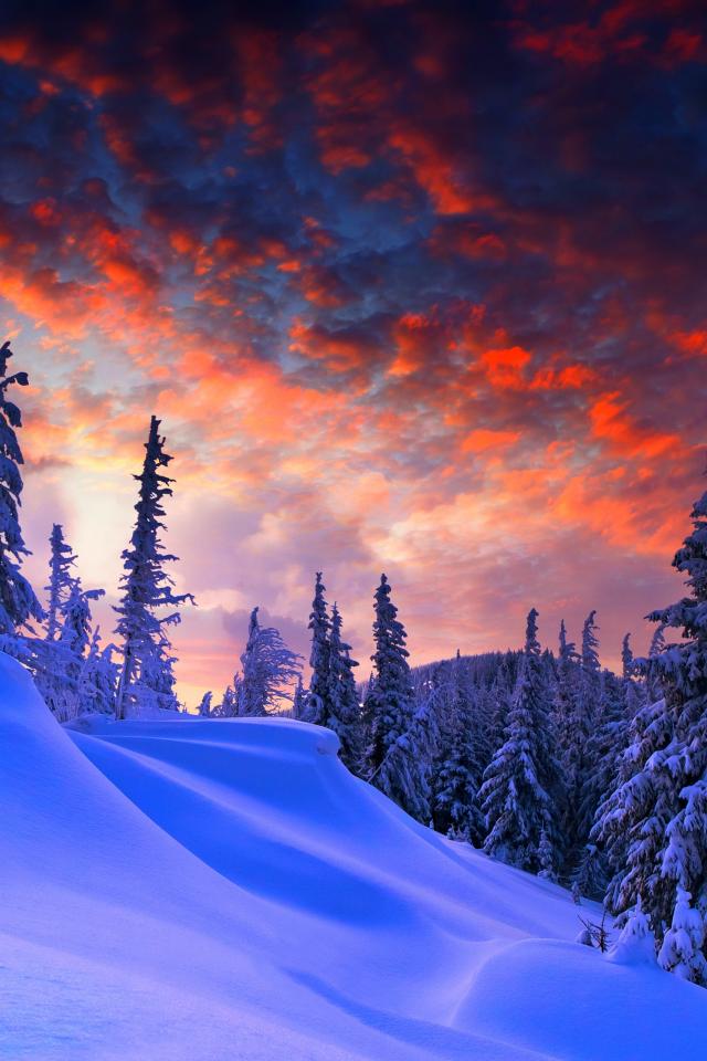 Wallpaper Red clouds in the sky above a snowy coniferous forest