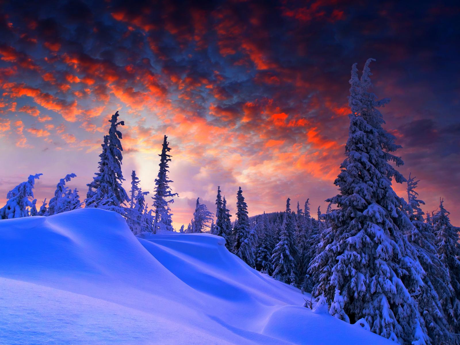 Wallpaper Red clouds in the sky above a snowy coniferous forest