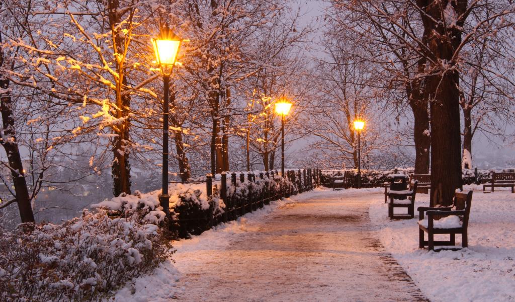 Wallpaper Snow-covered trees and bushes along the road in the winter park