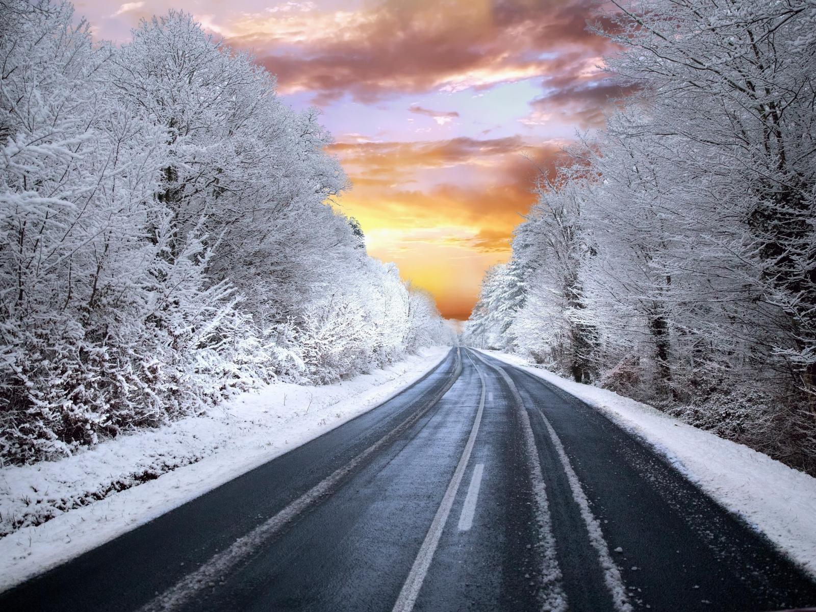 Wallpaper Frost-covered trees on a slippery road under a beautiful winter sky