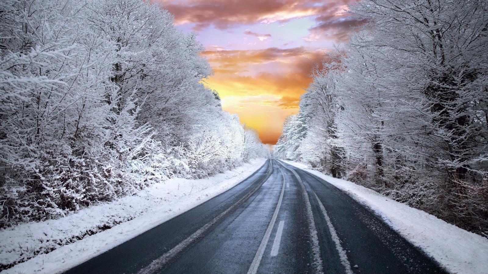 Wallpaper Frost-covered trees on a slippery road under a beautiful winter sky