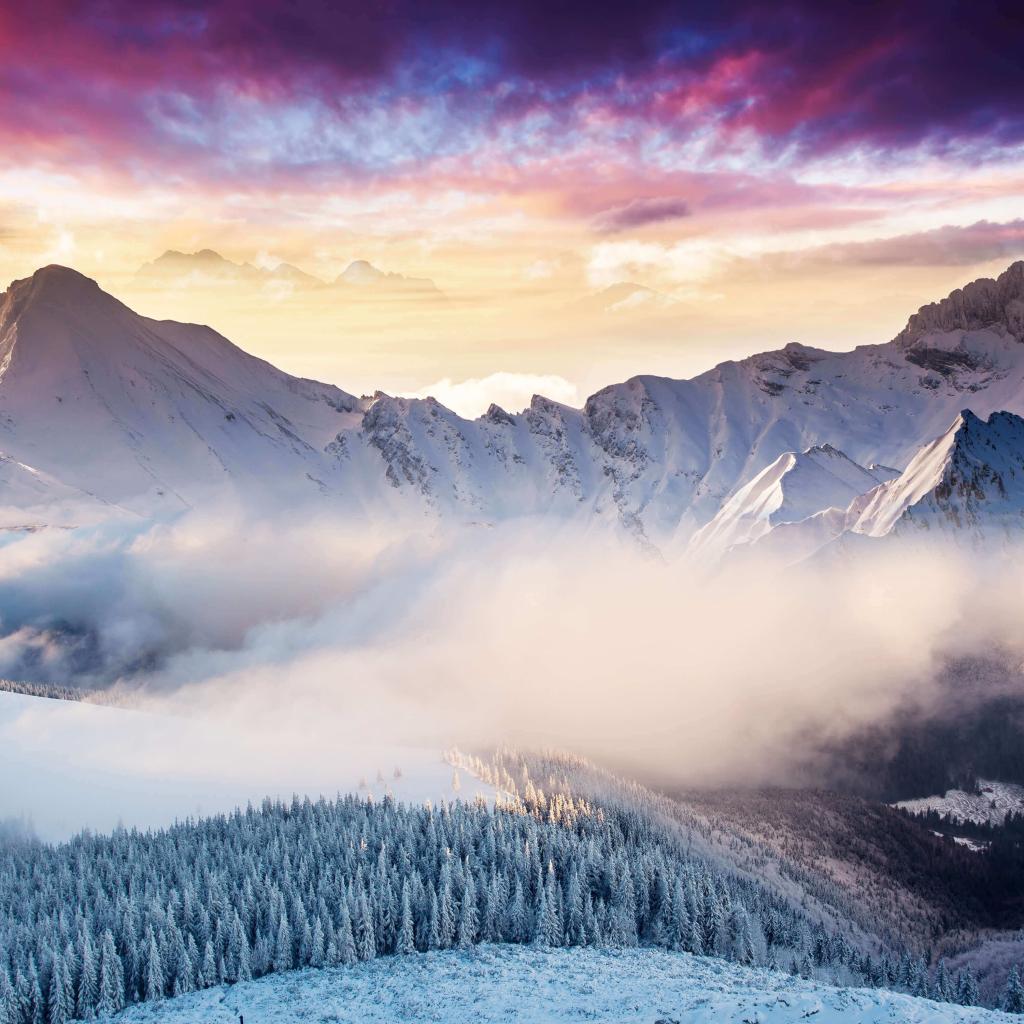 Wallpaper Fog over the forest near the snow-capped mountains in winter