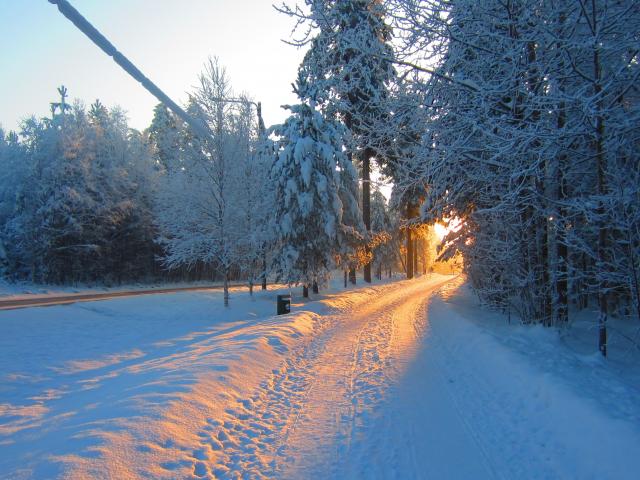 Wallpaper Snowy road in the forest with the rays of the bright winter sun