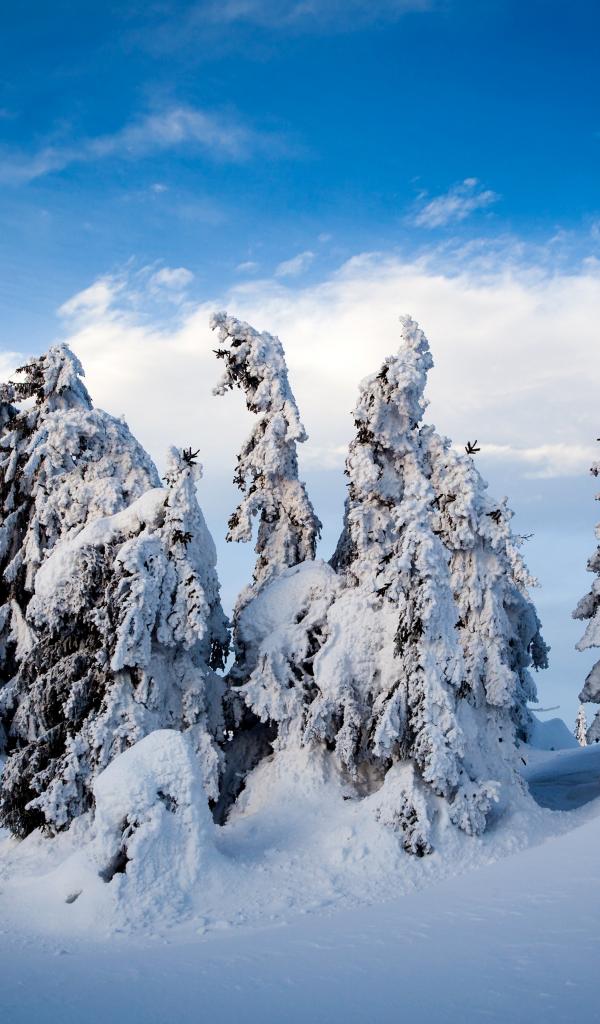 Wallpaper Beautiful tall firs in snowy forest in winter under blue sky