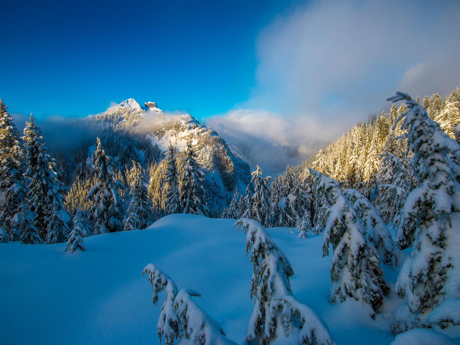 Wallpaper Mountains covered with snow-covered fir trees under a blue sky