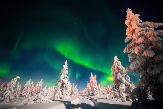 Wallpaper Northern lights over snowy fir trees on a winter night