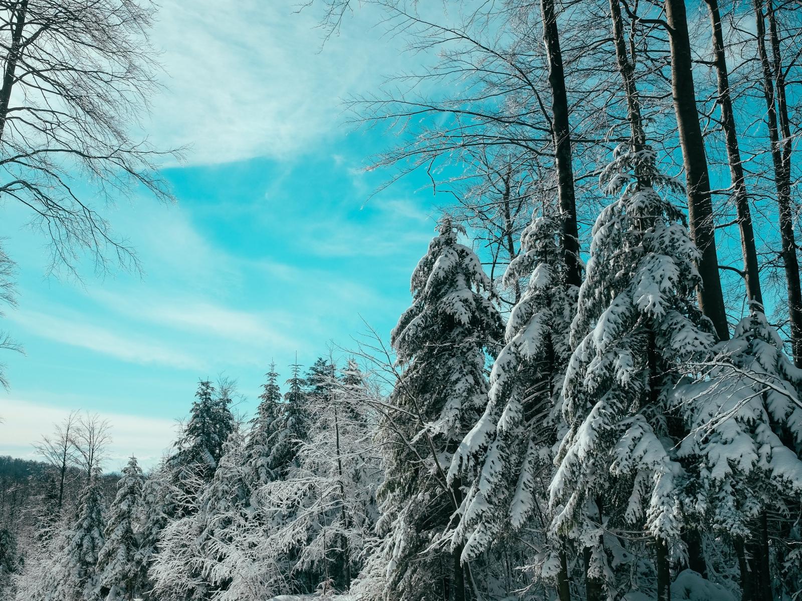 Wallpaper Snow-covered tall spruce under the blue sky