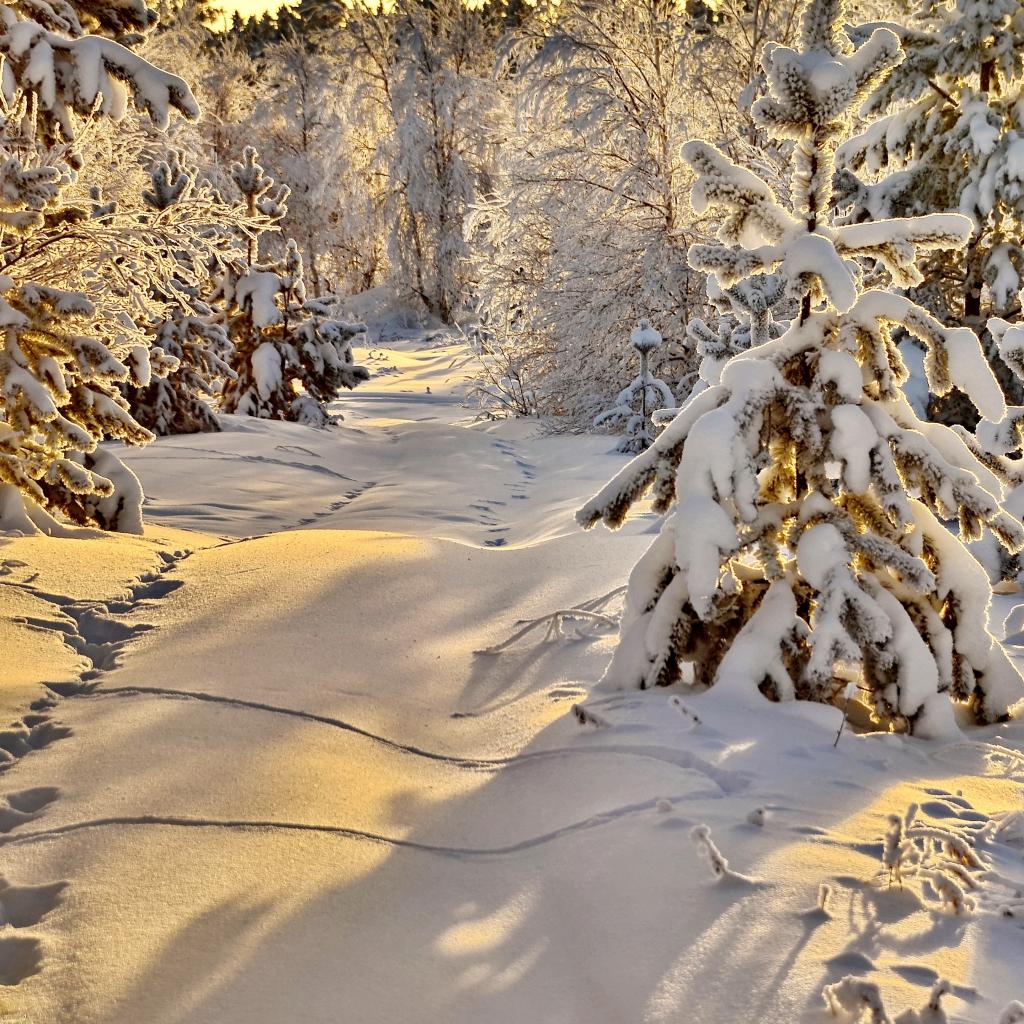 Wallpaper Animal tracks in the snow in a snowy sunny winter forest