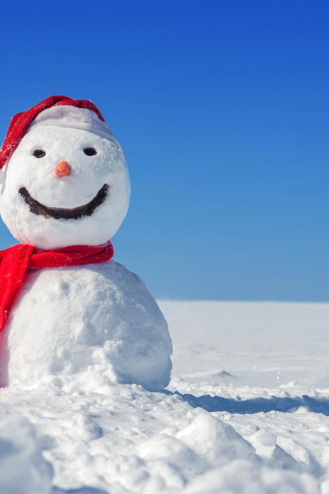 Wallpaper Cheerful snowman in a red hat on white snow